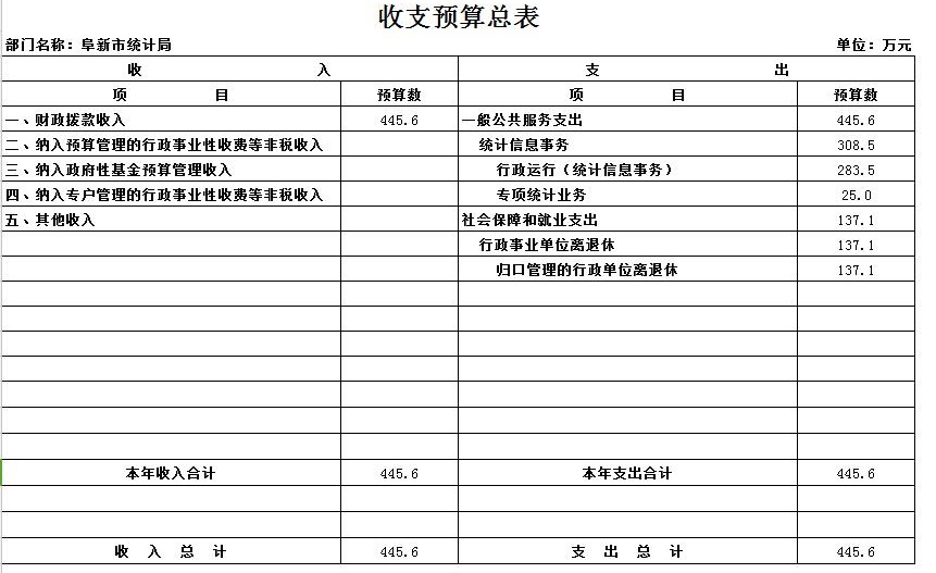 按照综合预算的原则,阜新市统计局所有收入和支出均纳入部门预算管理。收入包括:财政拨款收、纳入预算管理的行政事业性收费等非税收入、其他收入;支出包括:一般公共服务支出、社会保障和就业支出等。阜新市统计局2016年收支总预算445.55万元。