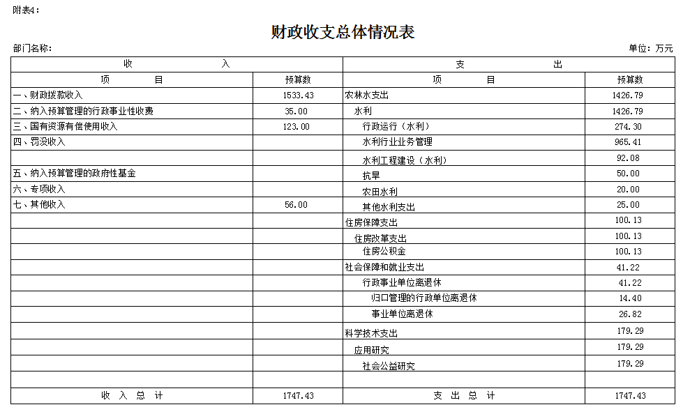 按照综合预算的原则,阜新市水利局所有收入和支出均纳入部门预算管理。收入包括:财政拨款收入、纳入预算管理的行政事业性收费收入、国有资源有偿使用收入等;支出包括:农林水支出、住房保障支出、社会保障和就业支出、科学技术支出等支出。阜新市水利局2018年收支总预算1747.43万元。
