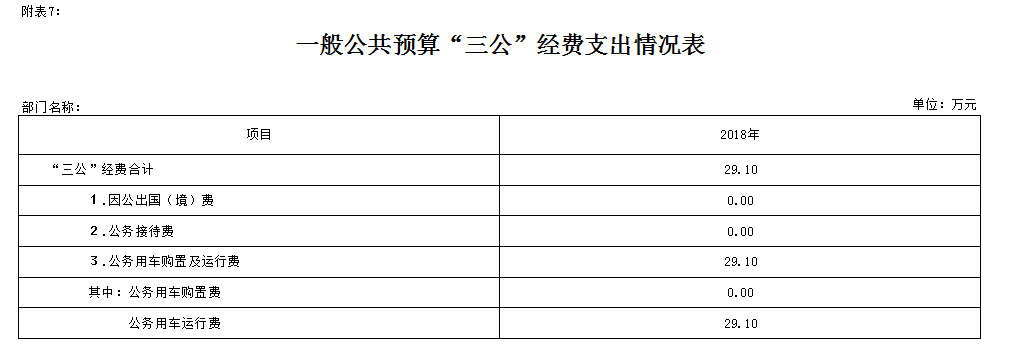 2018年“三公”经费预算数29.1万元,包括:公务用车购置及运行费29.1万元,公务用车运行费29.1万元。