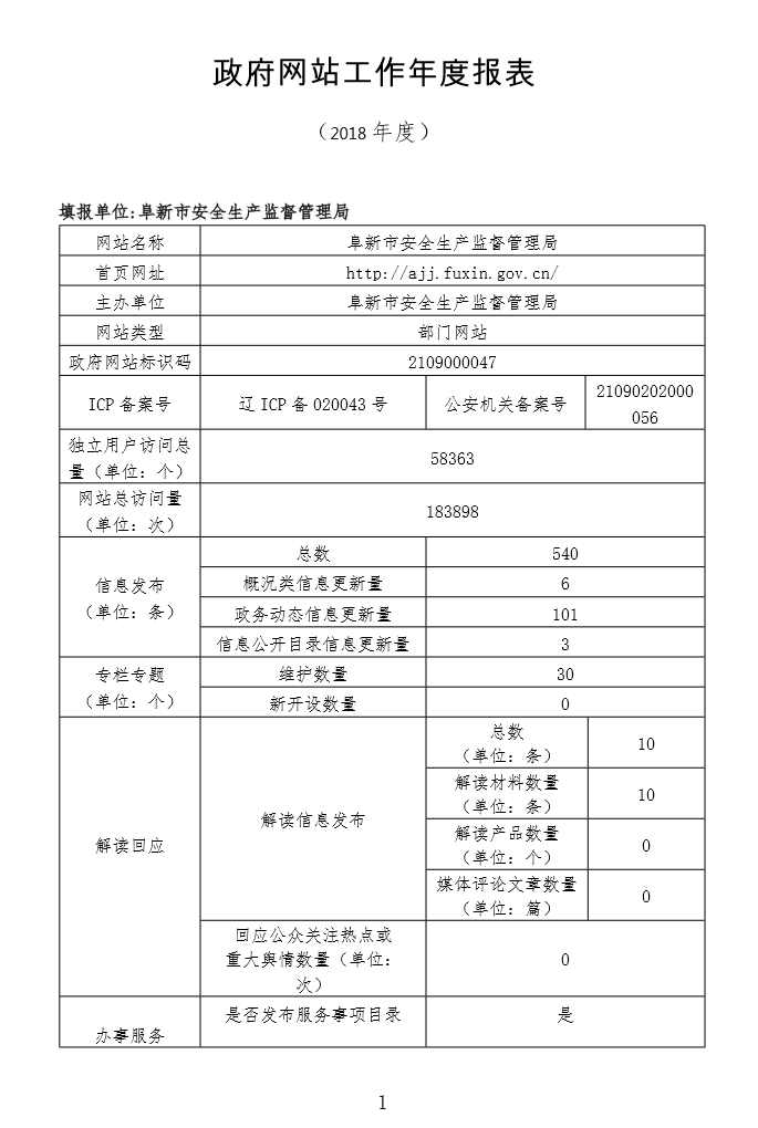 2018年阜新市安全生产监督管理局网站工作年度报表
