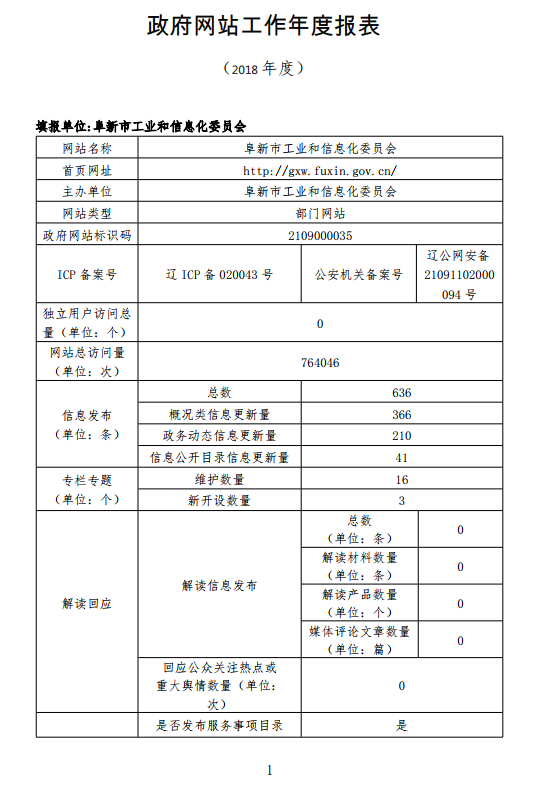 2018年阜新市工业和信息化委员会网站工作年度报表