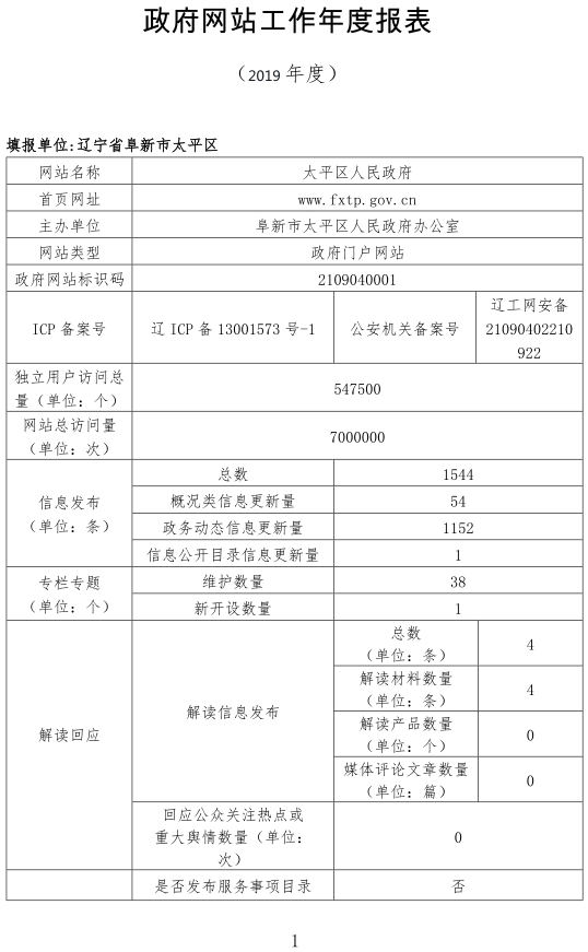 2019年阜新市太平区政府网站工作年度报表