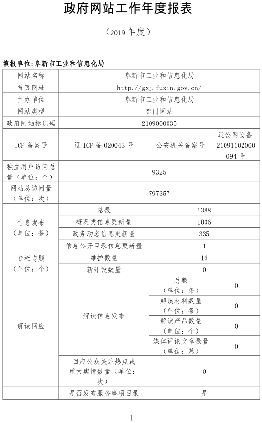 2019年阜新市工业和信息化局网站工作年度报表