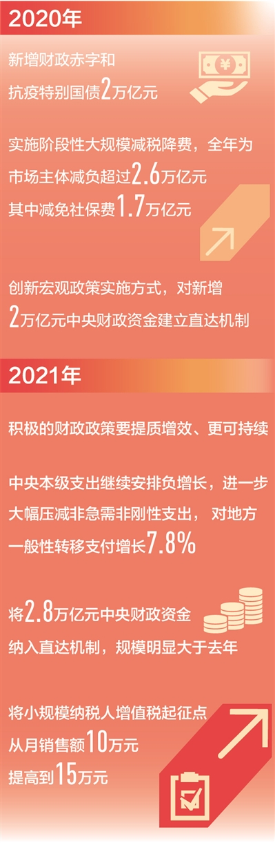 2020年,面对严峻复杂的国内外形势,特别是新冠肺炎疫情的严重冲击,财政政策精准发力:把赤字率提高到3.6%以上,发行1万亿元抗疫特别国债,安排地方新增专项债券3.75万亿元……“一系列有力举措,有效对冲疫情造成的财政减收增支影响,为稳住经济基本盘、兜牢民生底线提供重要财力支撑。”中国税务学会副会长张连起委员表示。
