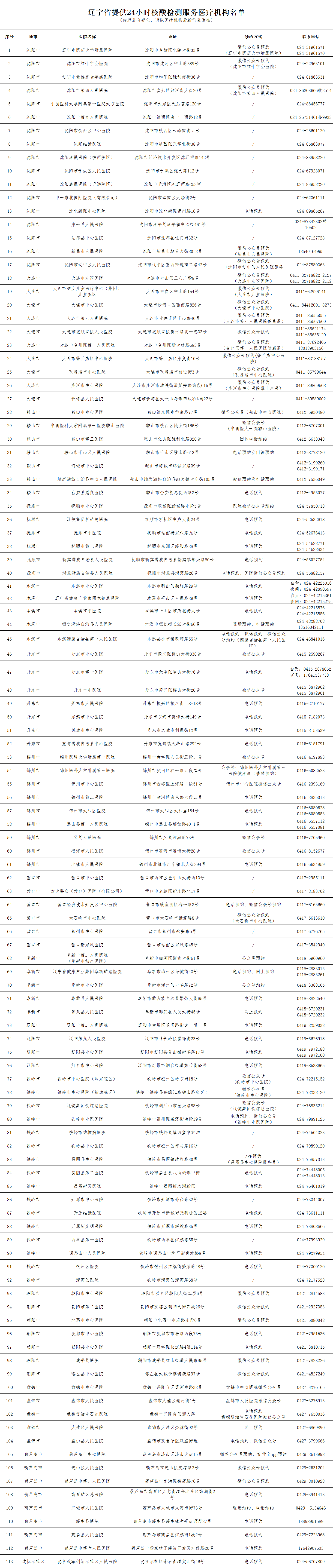 辽宁省提供24小时核酸检测服务医疗机构名单