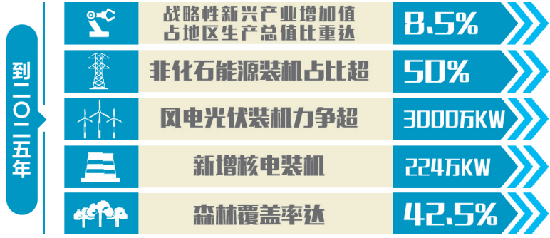 基础设施是向“绿”转型的难点也是重点。《任务措施》引导全省要因地制宜推动能源体系绿色低碳转型,加快交通基础设施绿色发展,不断改善城乡人居环境,加强农业基础设施建设。到2025年,非化石能源装机占比超过50%,风电光伏装机力争达到3000万千瓦以上,新增核电装机224万千瓦,新建高效节水灌溉工程100万亩以上,森林覆盖率达到42.5%。
