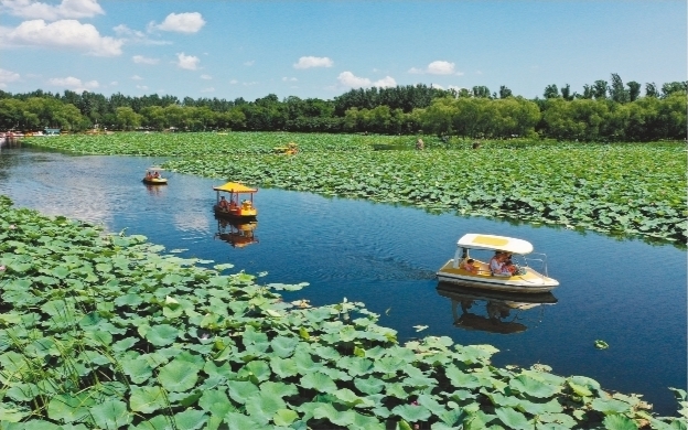 接天莲叶无穷碧,映日荷花别样红。”盛夏时节,北接东陵公园的沈阳天柱排青公园中荷花陆续盛开,一朵朵荷花在蓝天白云的映衬下随风摇摆,生机无限,呈现一片夏日美景。
