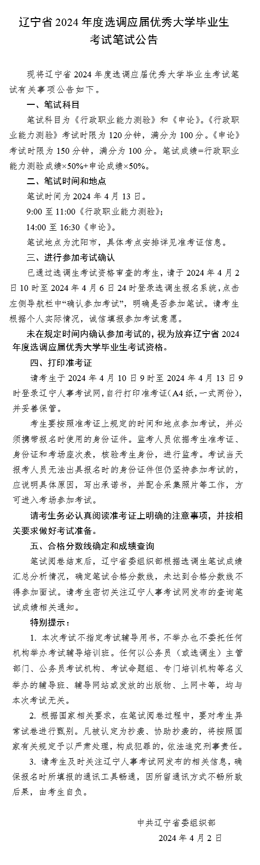 辽宁省2024年度选调应届优秀大学毕业生考试笔试公告
