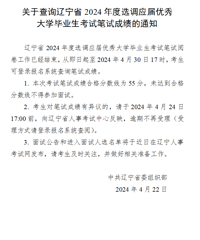 关于查询辽宁省2024年度选调应届优秀大学毕业生考试笔试成绩的通知