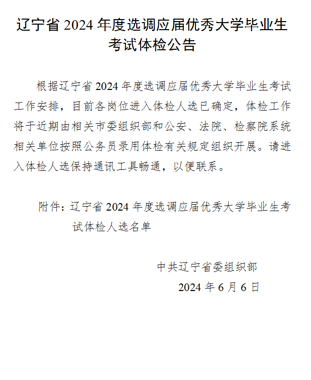 辽宁省2024年度选调应届优秀大学毕业生考试体检公告