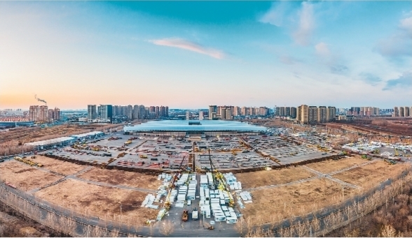 图为无人机拍摄的沈阳方舱医院应急改造工程和健康驿站工程建设场景。